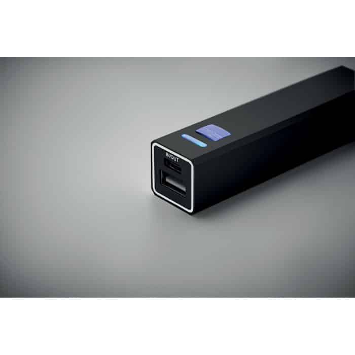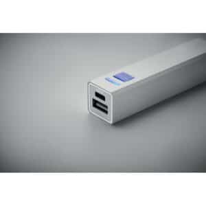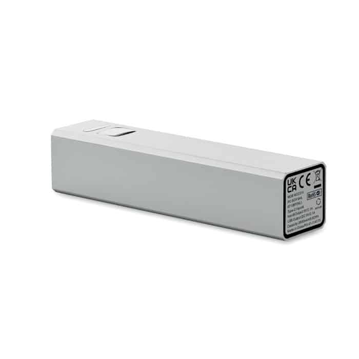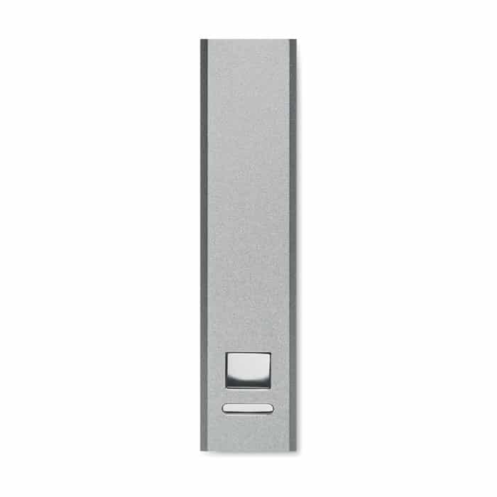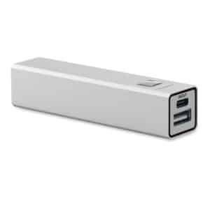 Powerbank . 2600 mAh. Recycled aluminium (GRS). Outputs: USB-C and USB-A up to 10W. Input: USB-A 10.5W. USB-C to USB-C cable (2A) with USB-A adapter included.