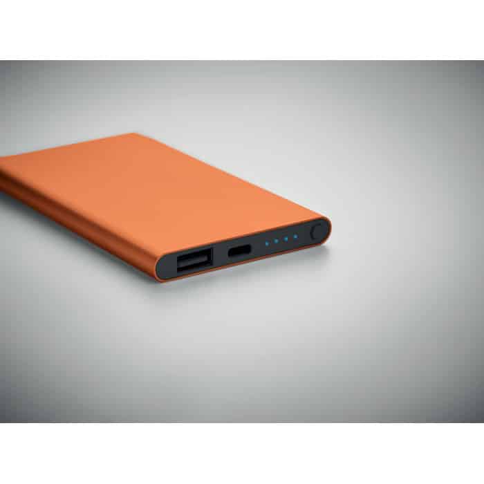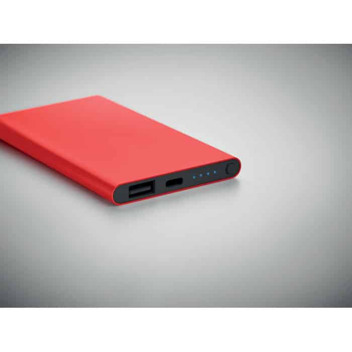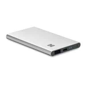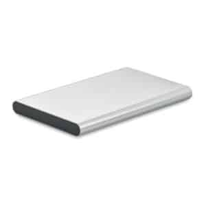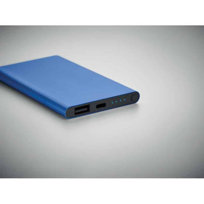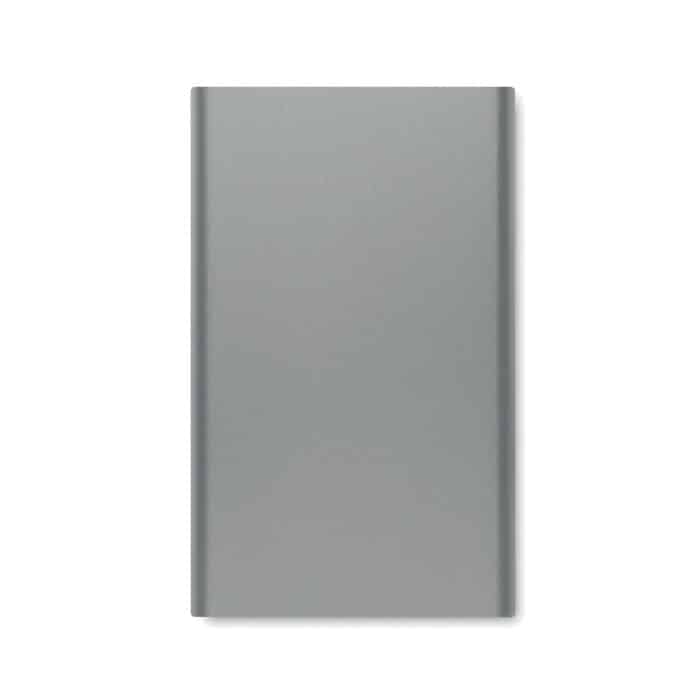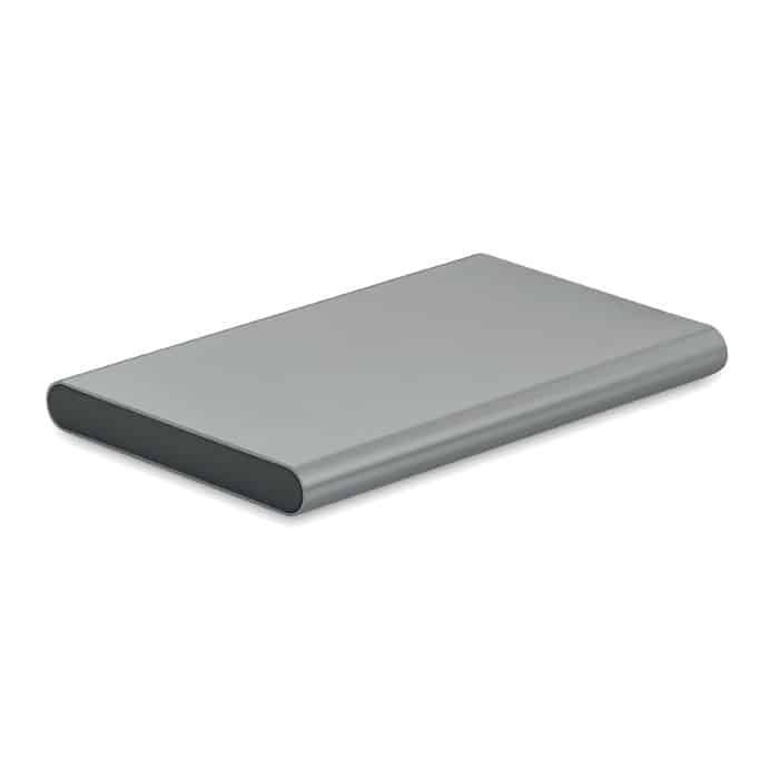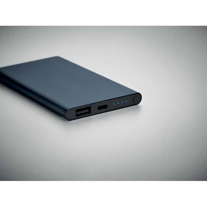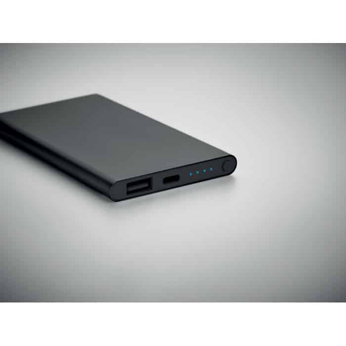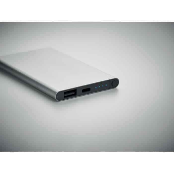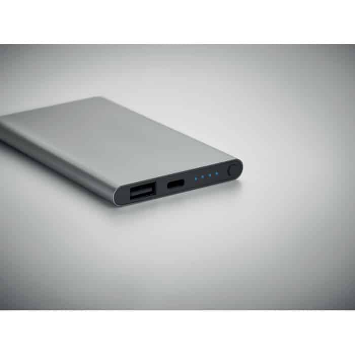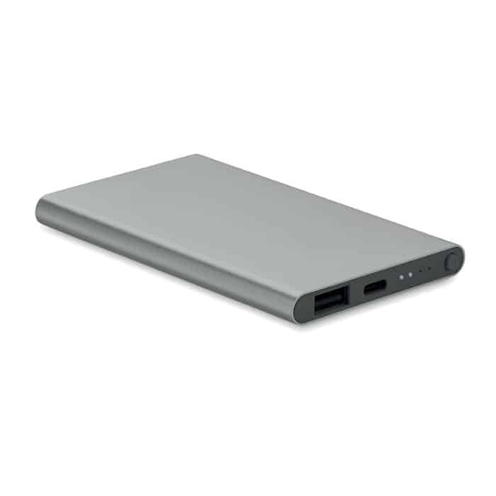 Powerbank. 4000 mAh. Recycled aluminium and ABS (GRS). Outputs: USB-C and USB-A up to 10W. Input: USB-C 10W. USB-C to USB-C cable (2A) with USB-A adapter included.