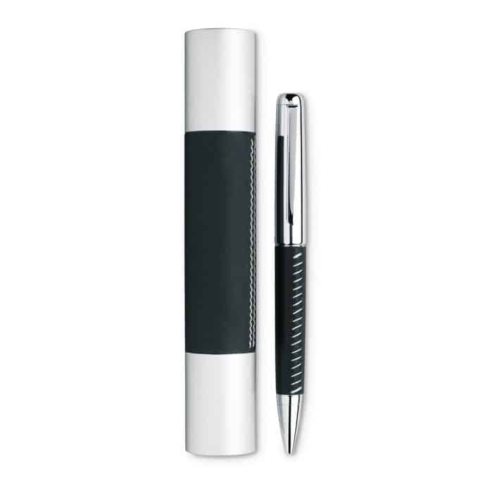 Metal ball pen with silver chrome finish and PU leather application in aluminium tube box. Black ink.