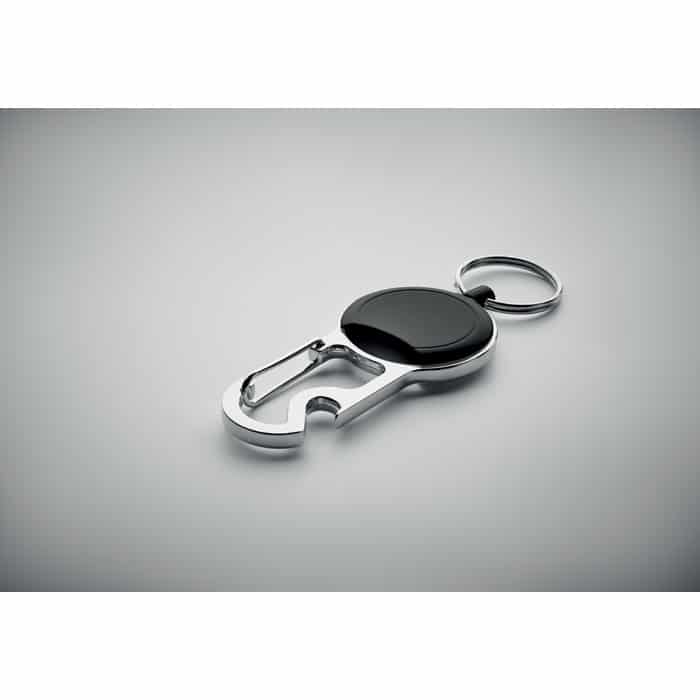 Retractable badge holder in ABS with clip, key ring and bottle opener.