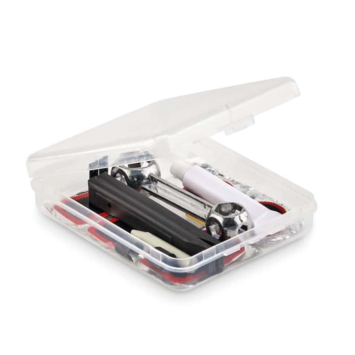 Bike repair kit with 1 wrench, 2 tyre levers, 1 glue, 2 valve caps, 2 valve tubes, 1 grater, 5 repair patches. Presented in transparent box.