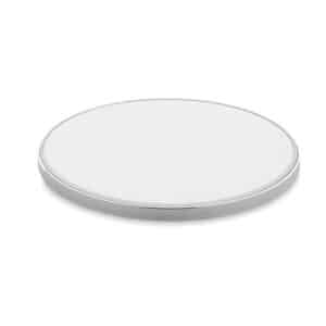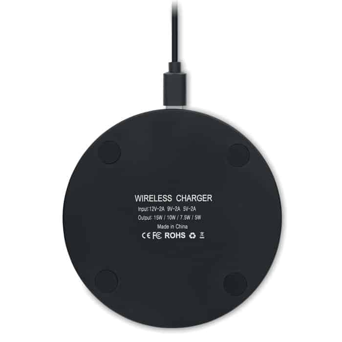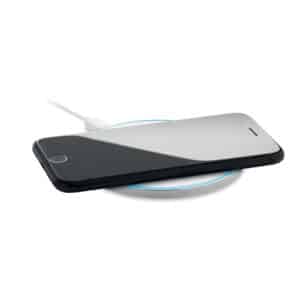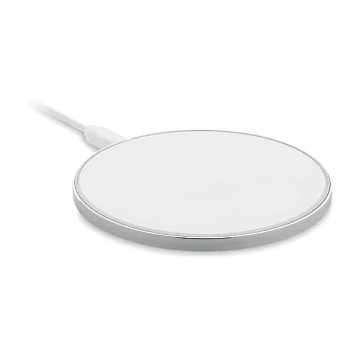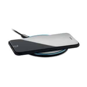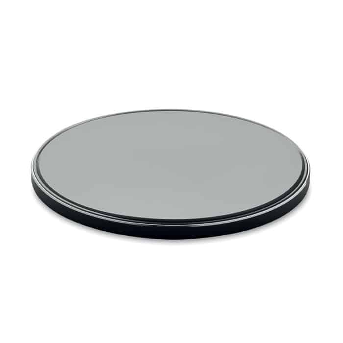 Aluminium Wireless charger 10W with glass on top. Connect device to your computer, lay down smartphone on it and let it charge. Blue light when charging. Output: DC 9V/1.1A.