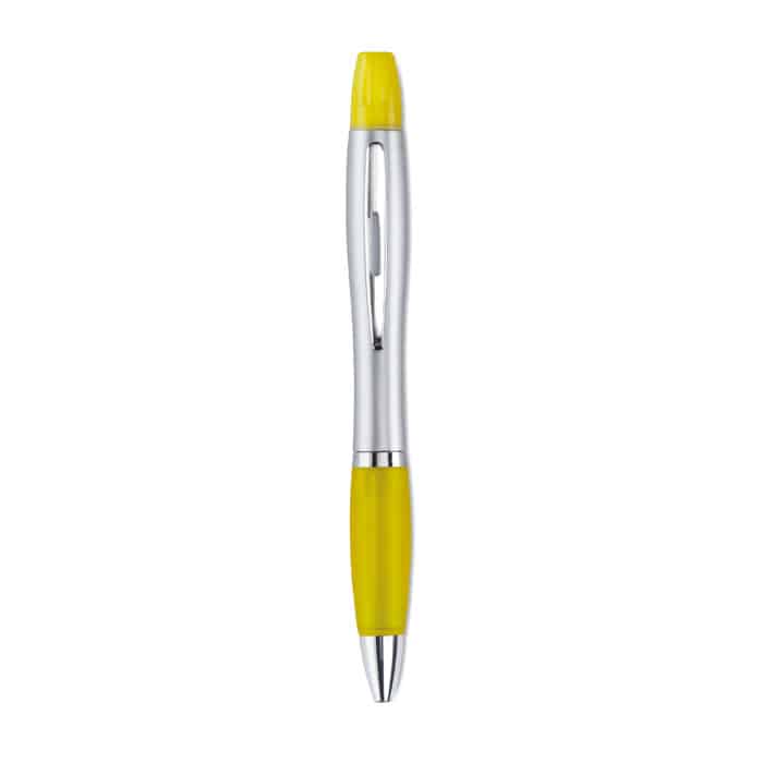 2 in 1 plastic ball pen and highlighter in silver satin finish and chromed fittings. Blue ink.