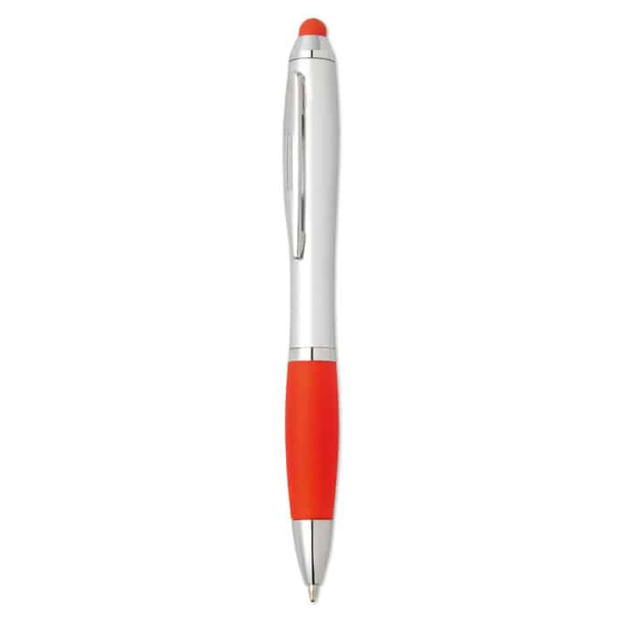 Twist action ball pen in ABS with stylus soft grip and matching tip. Blue ink