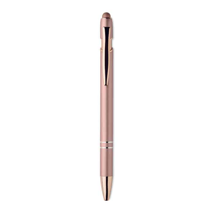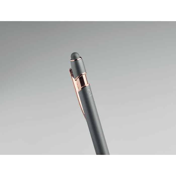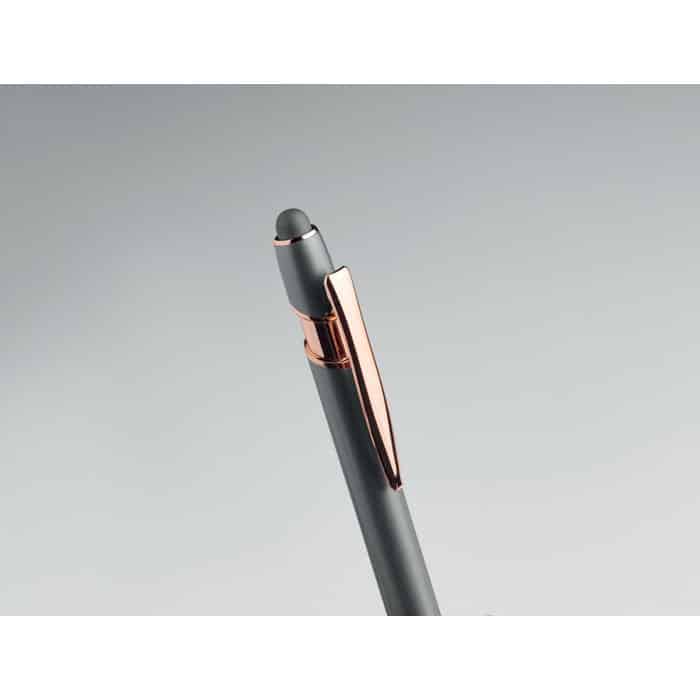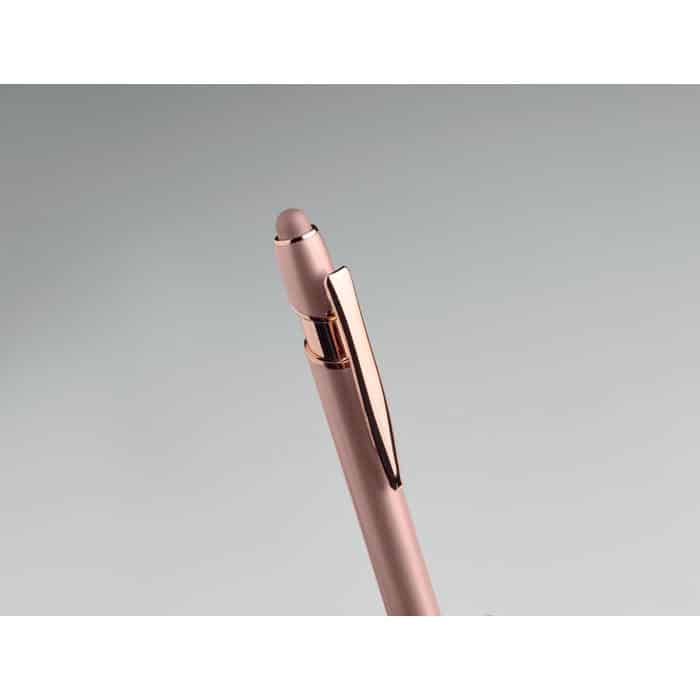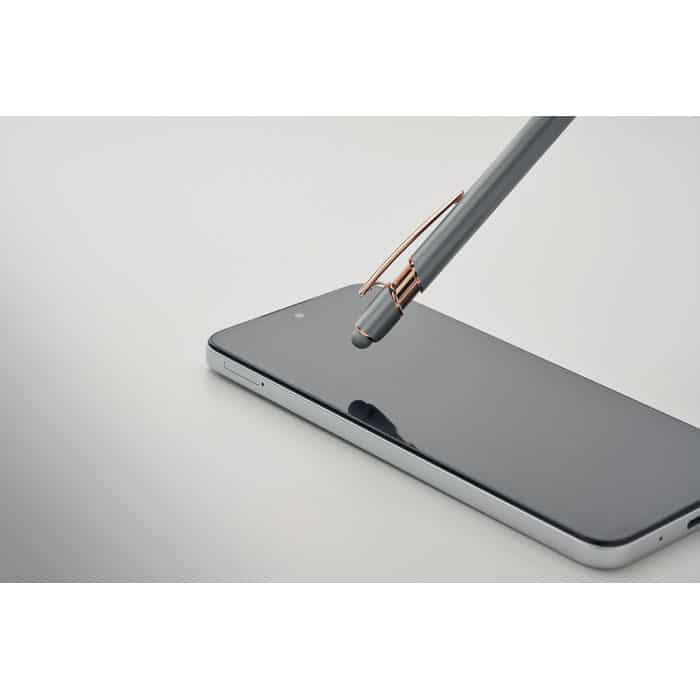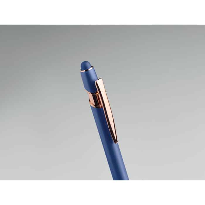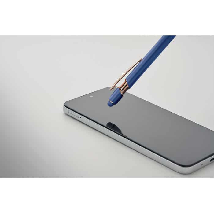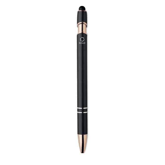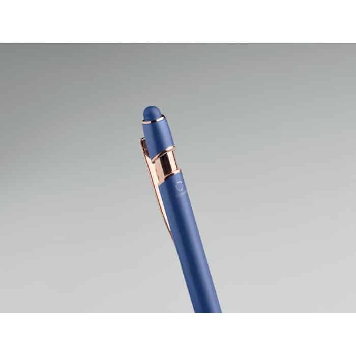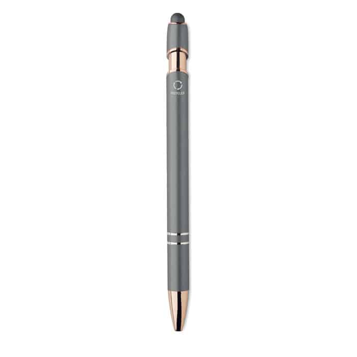 Recycled aluminium stylus push ball pen with rose gold details. Blue ink.