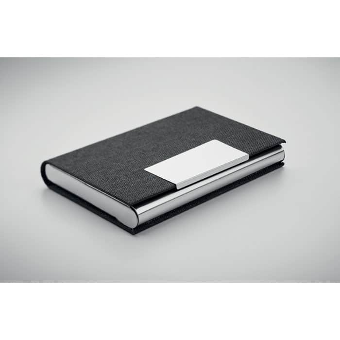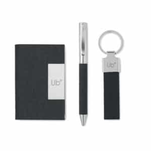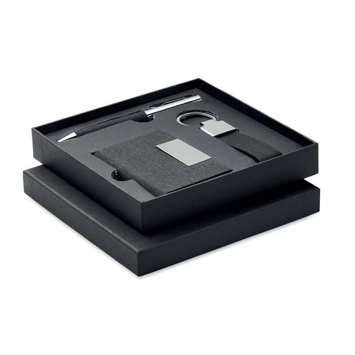 3 piece gift set in gift box. Including metal twist ball pen with RPET polyester detail, RPET polyester key ring and RPET polyester cardholder with metal plate. Blue ink.
