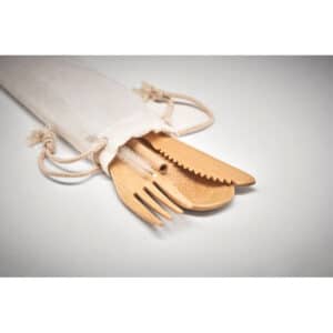 Re-usable bamboo cutlery set in canvas pouch. Includes knife, fork, spoon and straw in bamboo and stainless steel brush. Bamboo is a natural product, there may be slight variations in colour and size per item, which can affect the final decoration outcome.