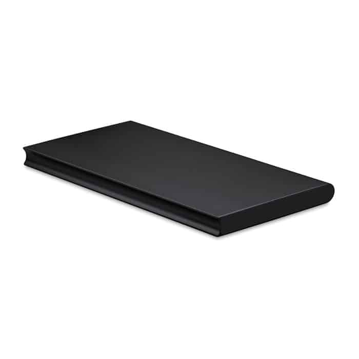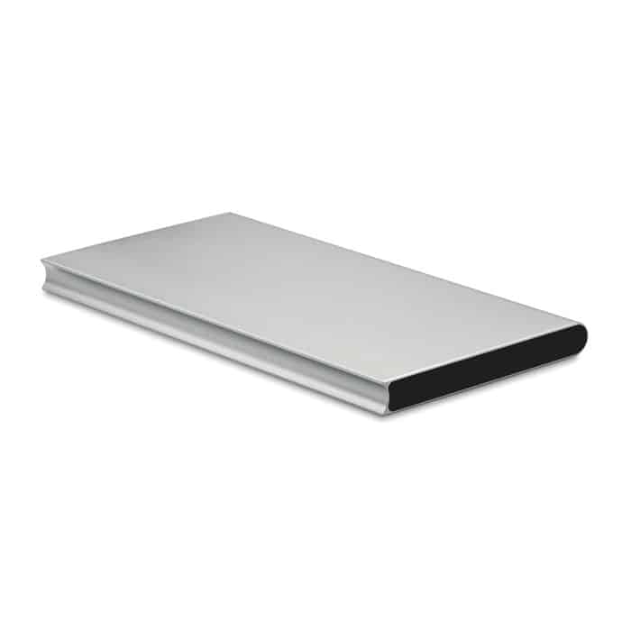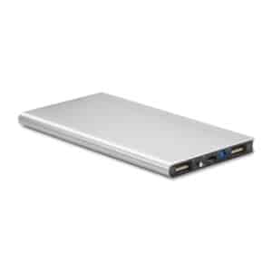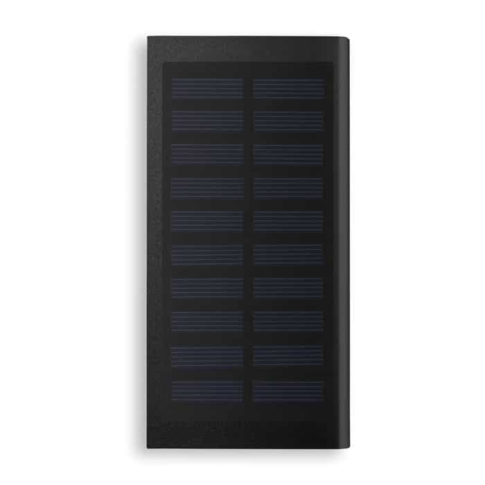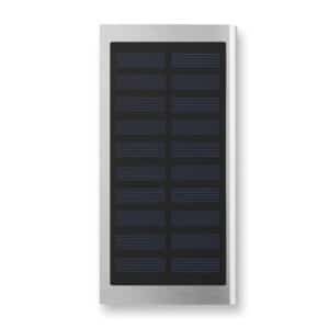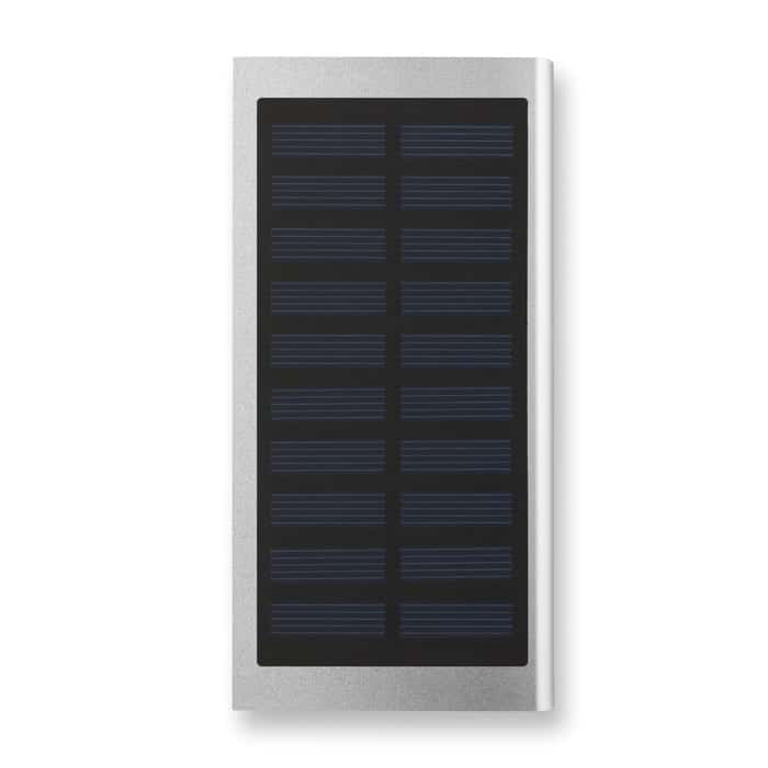 Solar powerbank. 8000 mAh. Recycled aluminium and ABS. Outputs: USB-A up to 10W. Input: USB-A 10W. Solar input 150–200mAh/h. 2 USB-A outputs. Built-in Micro USB plug. USB-A to Micro USB cable (30 cm) included.