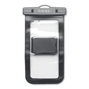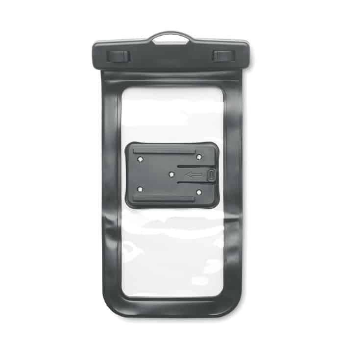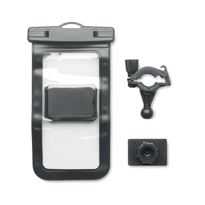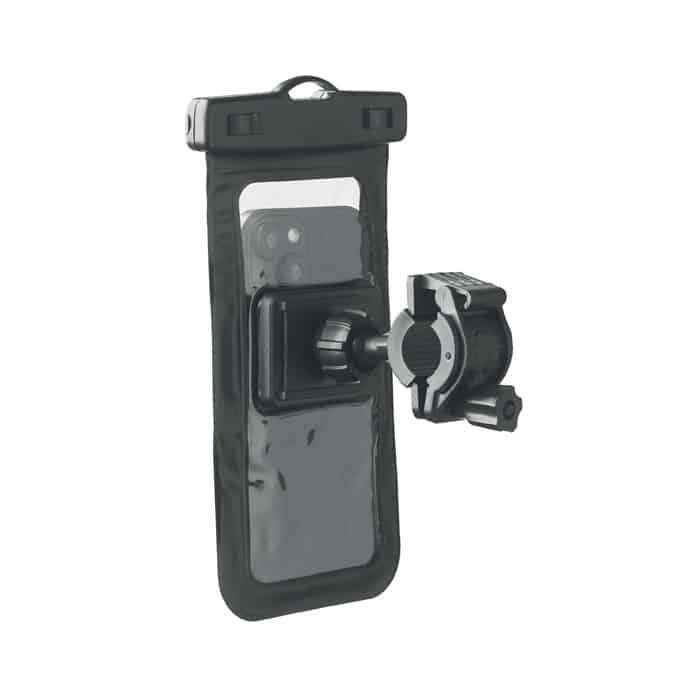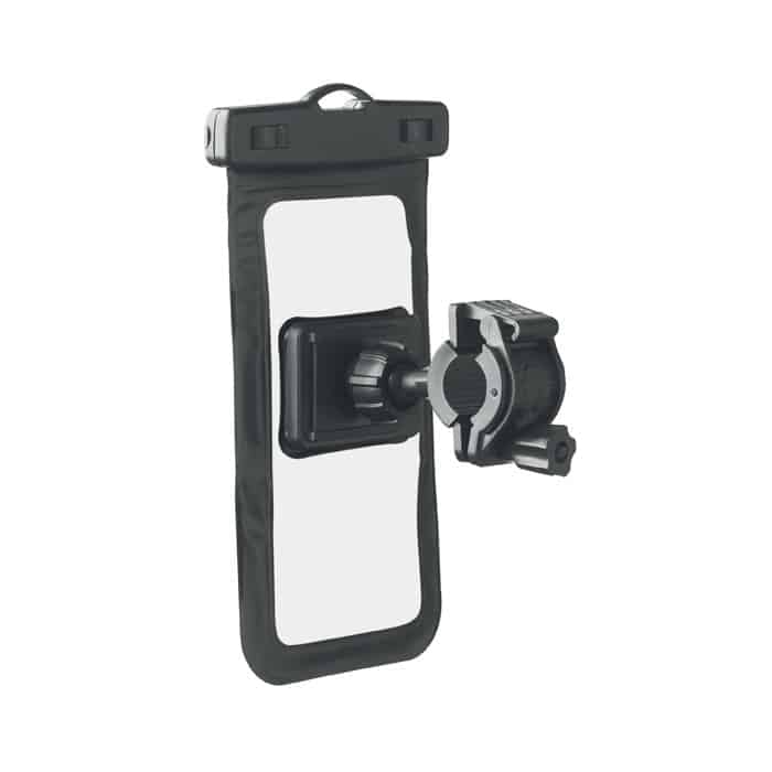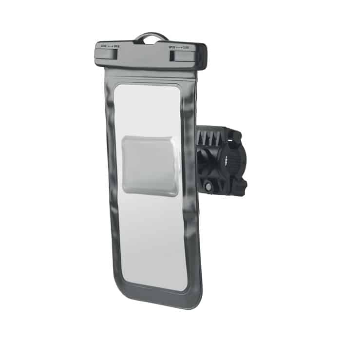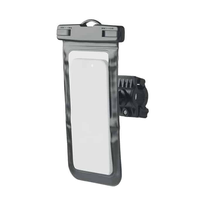 Waterproof bike mobile phone mount case in PVC, rotates through 360 degrees. Waterproof rating: IPX 6. Fits for 6,7 inch size.