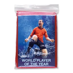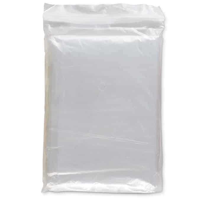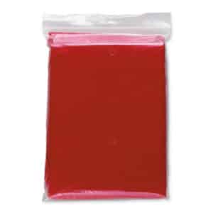 Foldable plastic poncho with attached hood, packed in a transparent polybag.