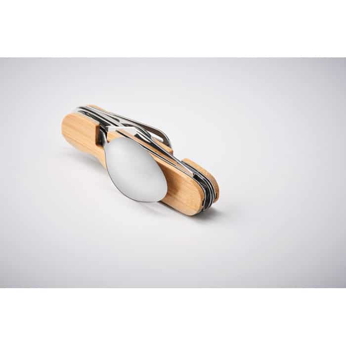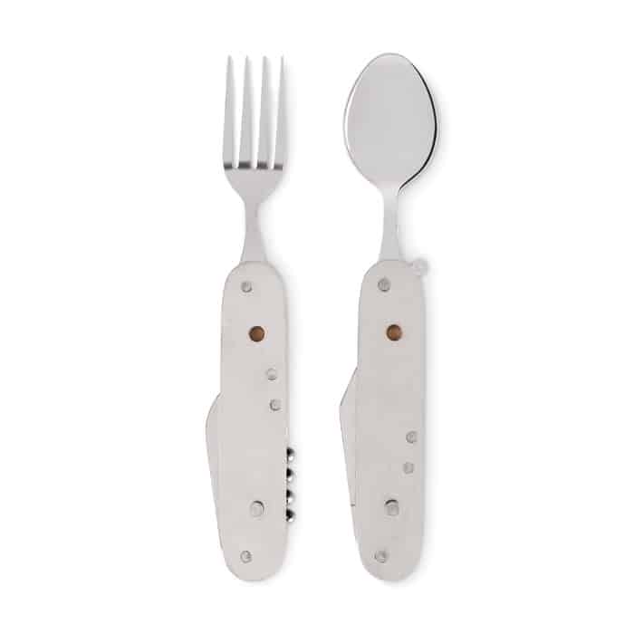 Metal multi-function folding camping cutlery set in wooden casing. 5 functions. Includes fork, spoon, can opener, wine opener and knife. You can separate the pieces in 2.