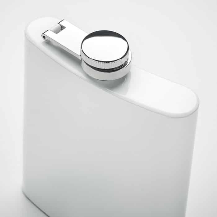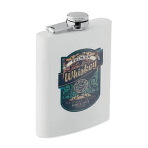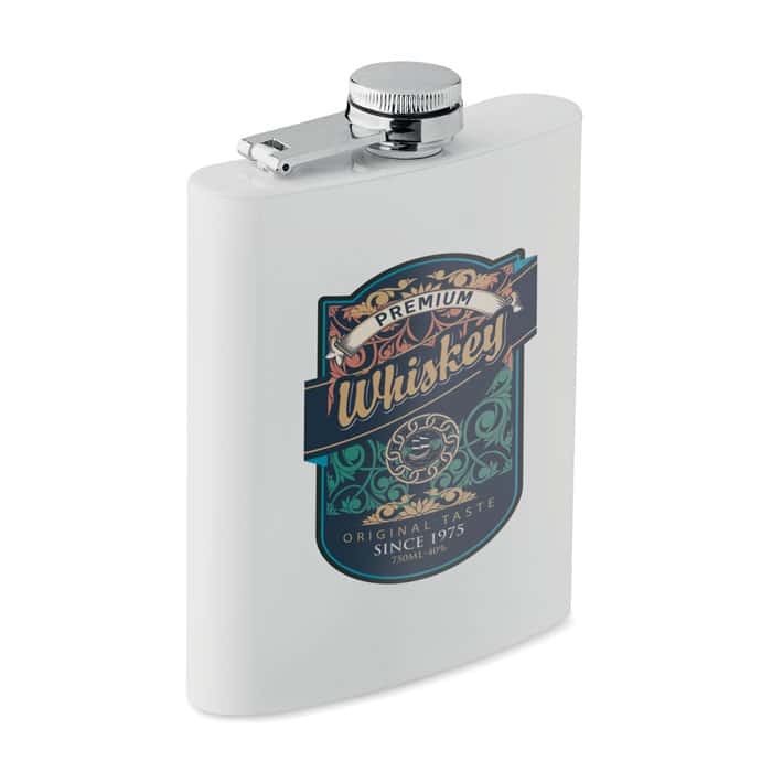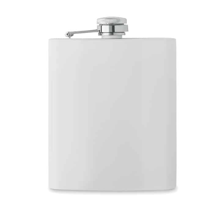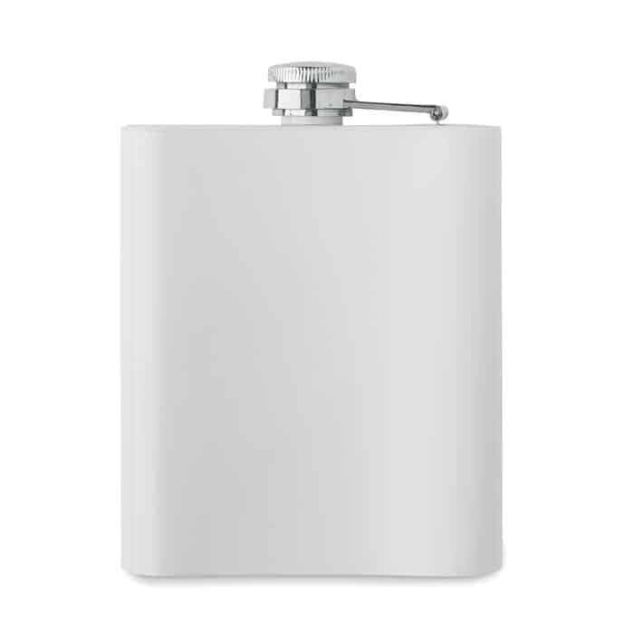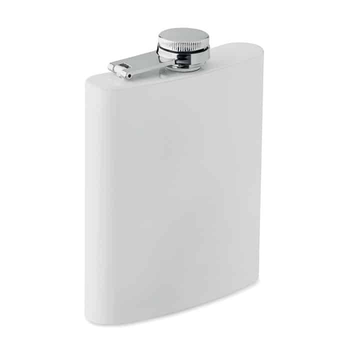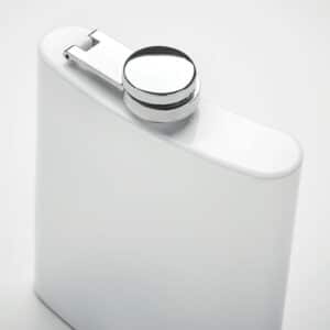Slim hip flask in recycled stainless steel (90% recycled stainless and 10% stainless steel) with sublimation layer. Single wall. Capacity: 180 ml.