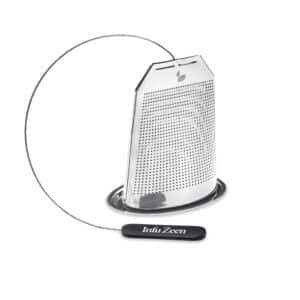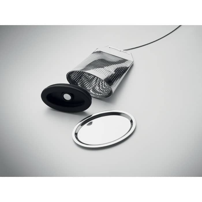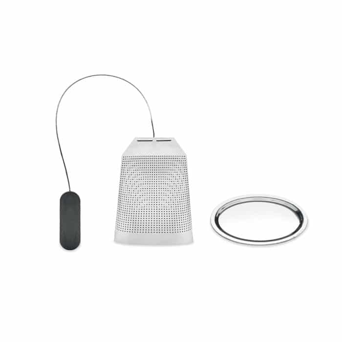 Stainless steel tea infuser in teabag shape with plate. Large tea strainer with silicone handle.