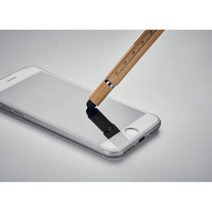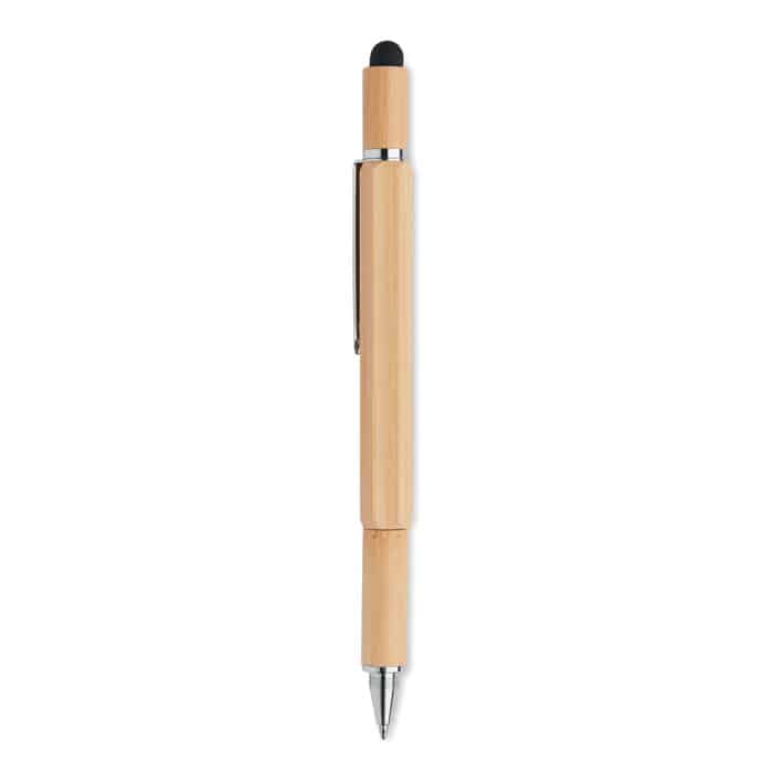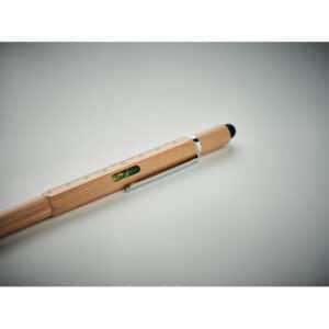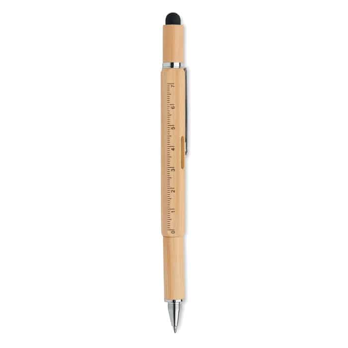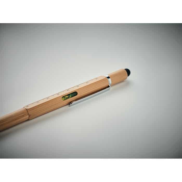 Twist action spirit level pen in bamboo with 7 cm ruler, stylus and Phillips head and flat head screw driver bits. Blue ink. Bamboo is a natural product, there may be slight variations in colour and size per item, which can affect the final decoration outcome.