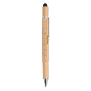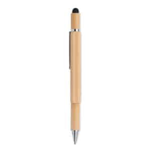 Twist action spirit level pen in bamboo with 7 cm ruler, stylus and Phillips head and flat head screw driver bits. Blue ink. This multi-functional pen is perfect to have on you when working on DIY projects. It has all the necessary tools for basic home projects.
