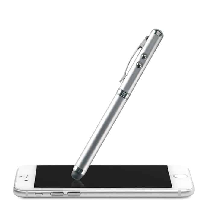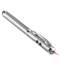 Laser pointer in metal. White LED light, red laser pointer and soft touch tip. Includes 3 button cell batteries. Delivered in metal tin box.