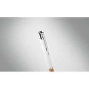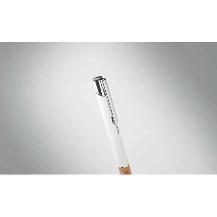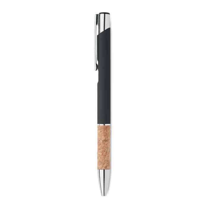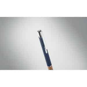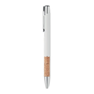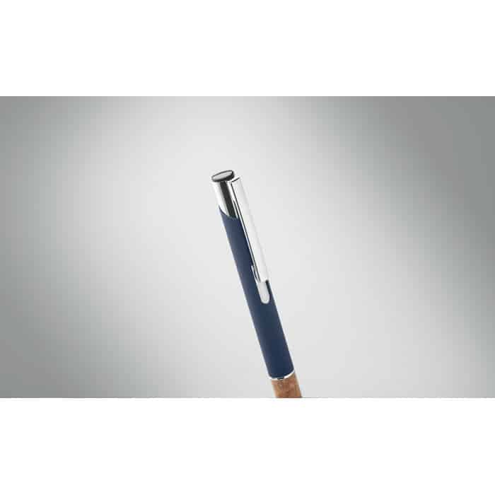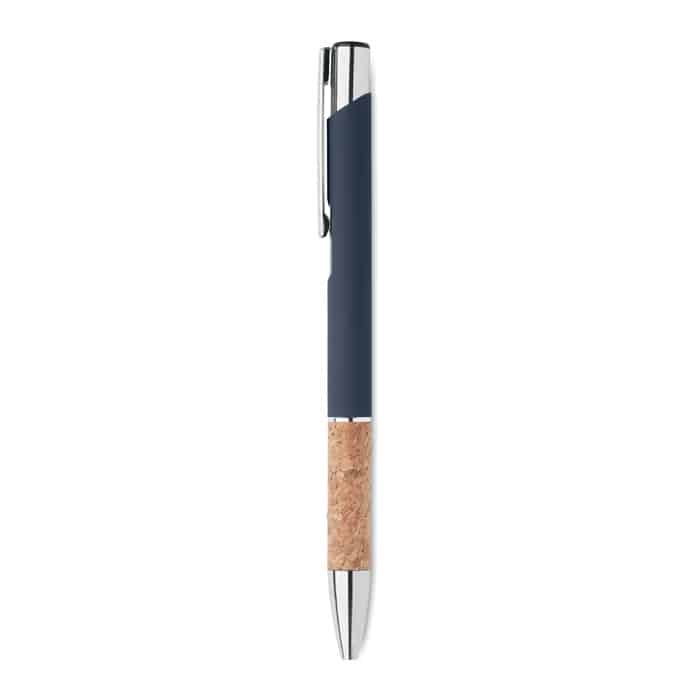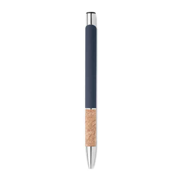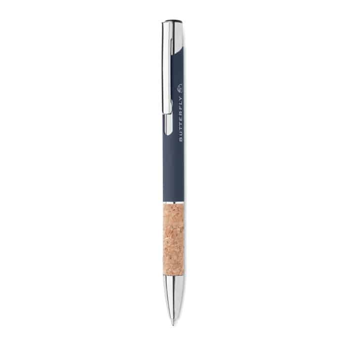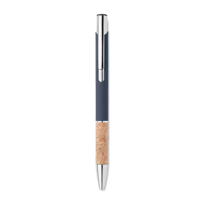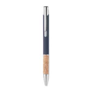 Push button pen in aluminium with cork grip. Blue ink.
