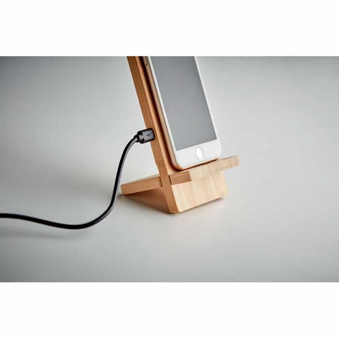 Double coil wireless charger stand in bamboo. Place smartphone on it to begin charging. It includes 2 parts, assembly required. Output: DC 9V/1.1A (10W) for quick charging. Bamboo is a natural product, there may be slight variations in colour and size per FSC 100% | N5.7 | FSC-C213206
