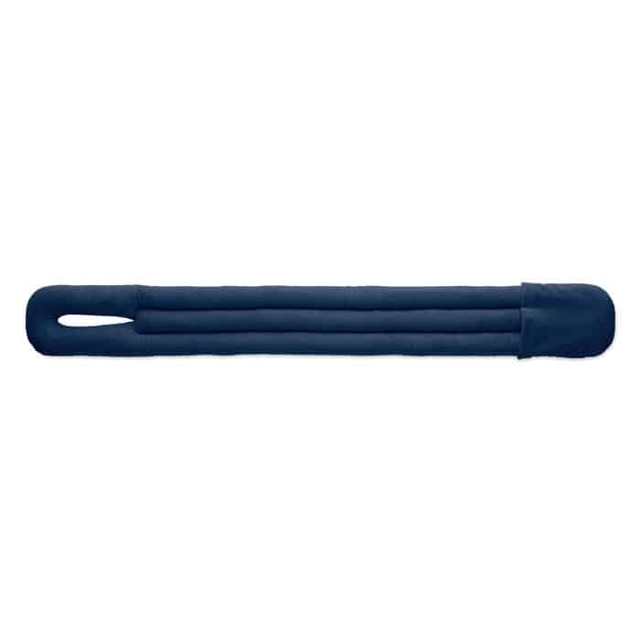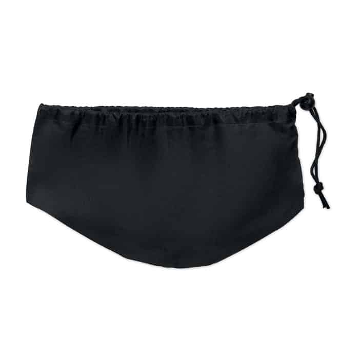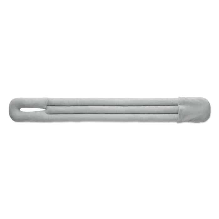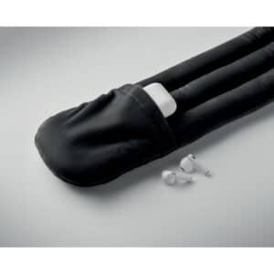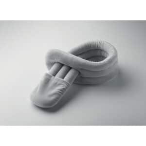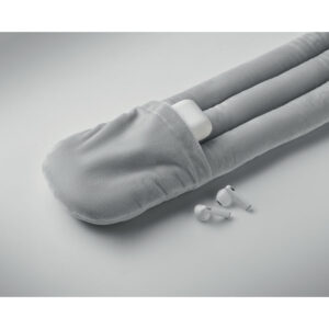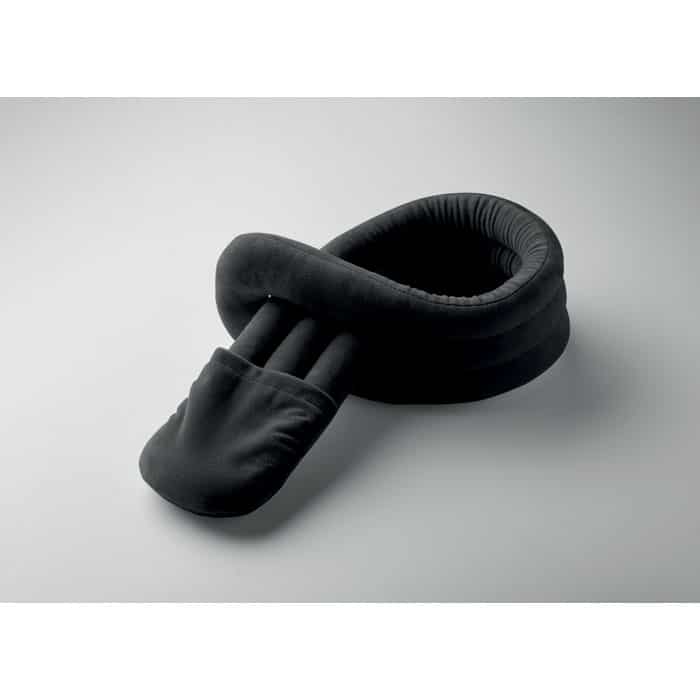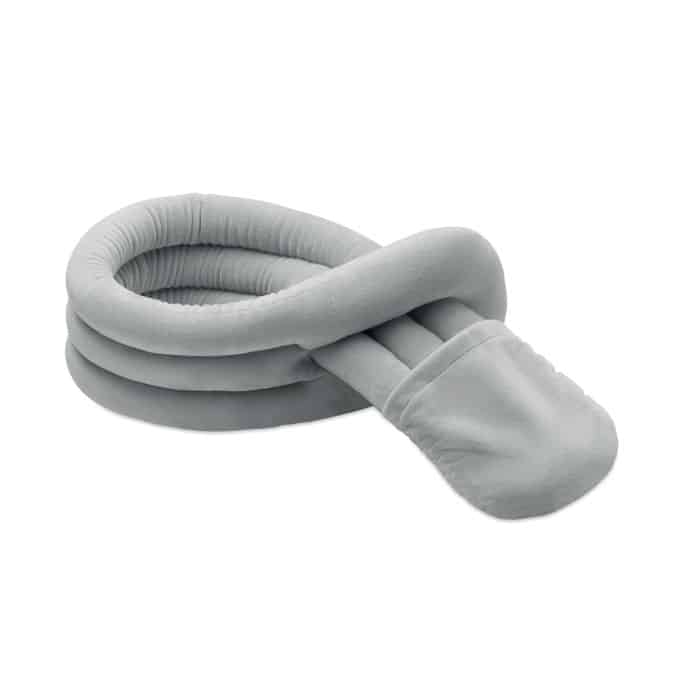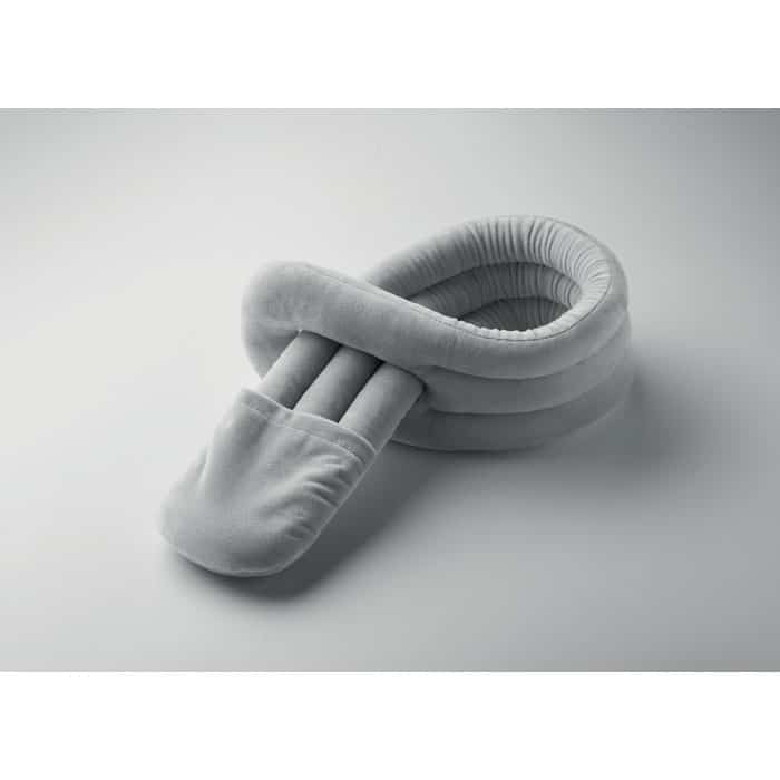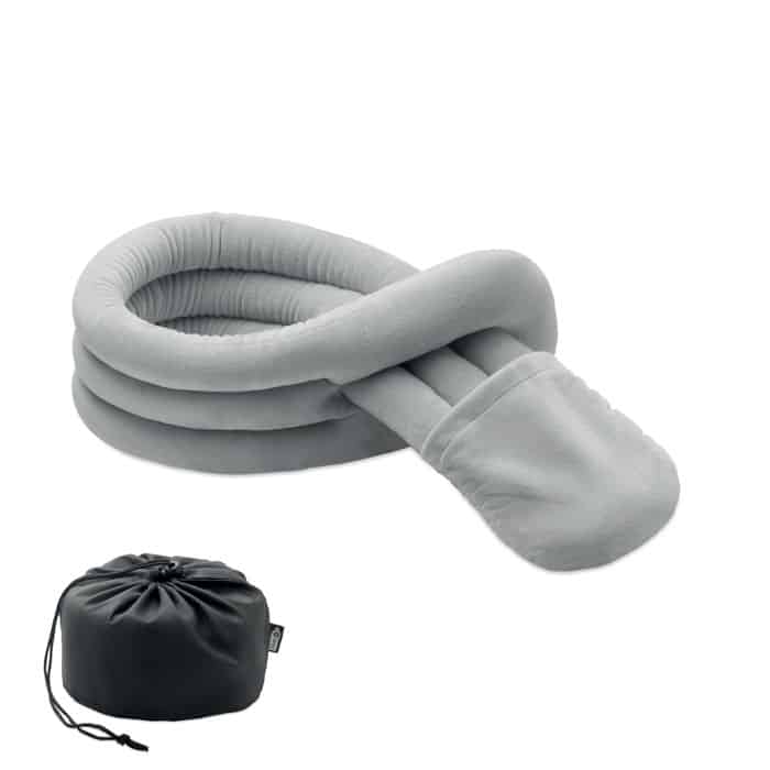 Bendable travel pillow made of soft polyester and foam. Includes RPET drawcord pouch for easy storage. Comfortable and compact for travel.